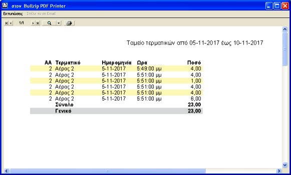 Δείτε μια εκτύπωση από το πρόγραμμα Εχουμε επιλέξει να πάρουμε αναφορά για το κερματοδέκτη στον αέρα 2 για την ημερομηνία από 5/11 έως 10/11